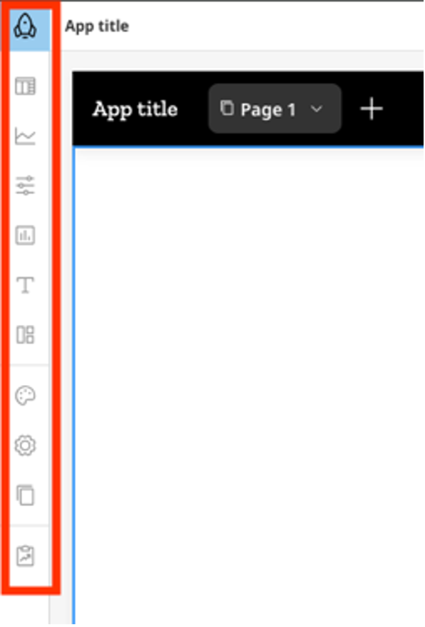 The Left Navigation Toolbar serves as the primary interface for organizing and adding structural elements to an app. This layout categorizes components by functional type and provides direct access to the full library of available visualizations.Toolbar Organization