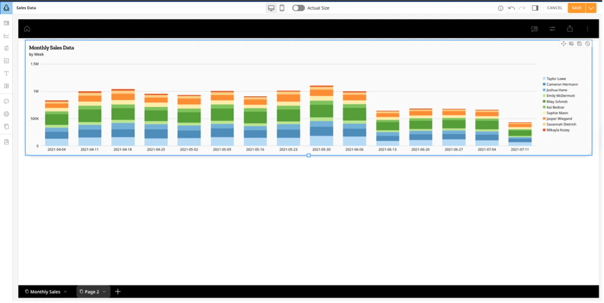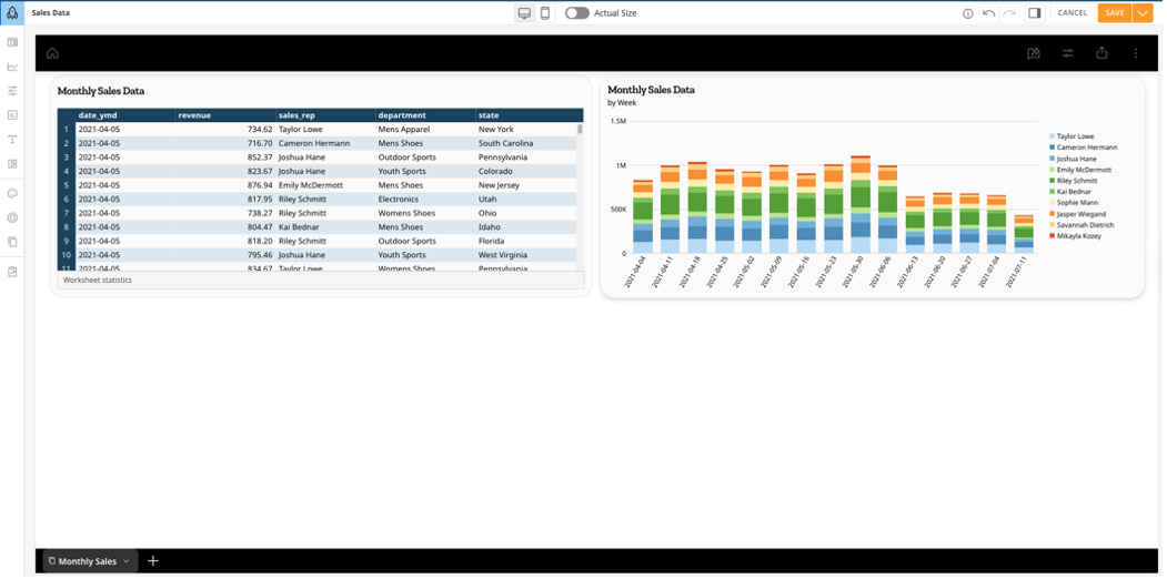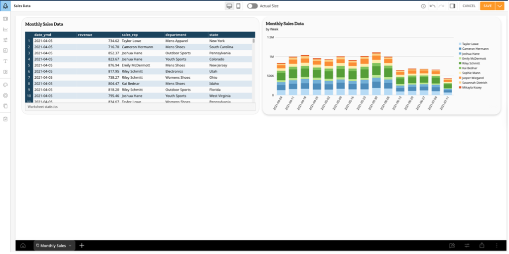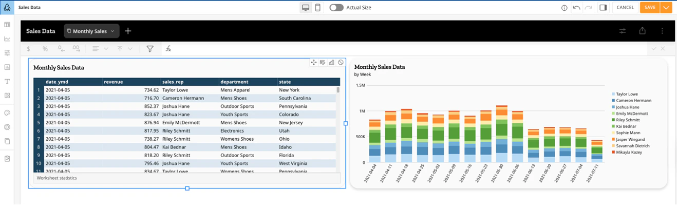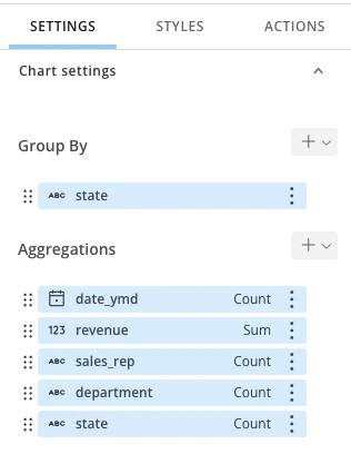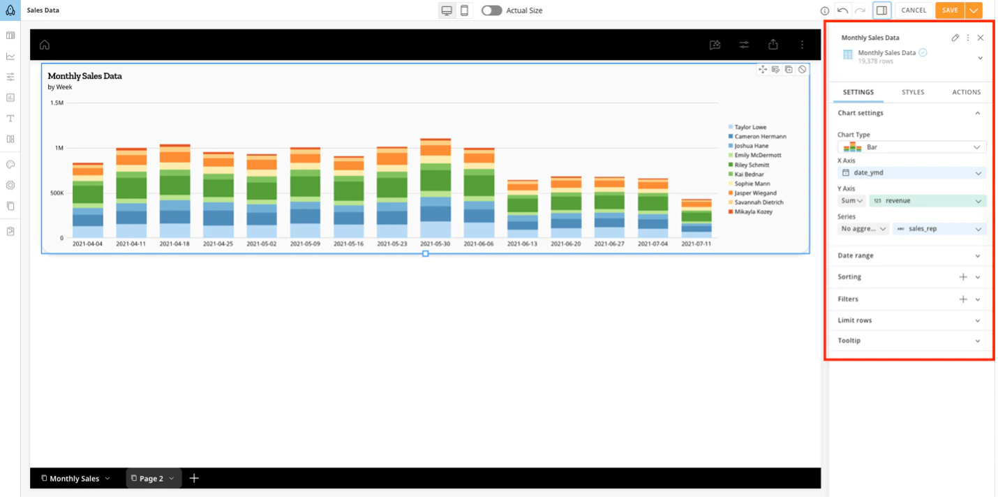 - Configure your chart settings and styles by selecting the chart. A right panel appears where you can edit, configure, sort, filter, and add styles to your charts.