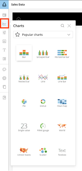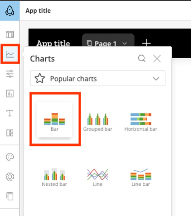 App Studio lets you add charts to your app and configure chart properties and styles without leaving the canvas. To add a chart, follow these steps:- Select the Charts icon from the left toolbar. A pop-up menu appears.