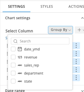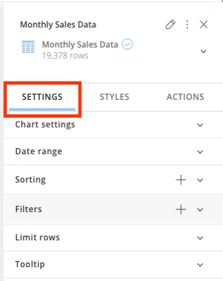 - Use the Settings tab to change chart settings, set date ranges, set filters, set sorting criteria, limit rows, and apply other chart-specific configuration.
