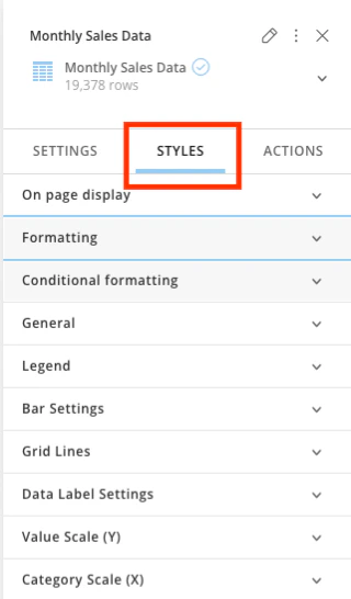 - Use the Styles tab to change or set colors, font types, font family, conditional formatting, general table or chart formatting, sorting settings, and additional chart-specific configuration.
