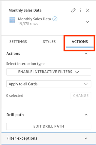 - Use the Actions tab to configure interactive filters, edit Drill Paths, and select filter exceptions.