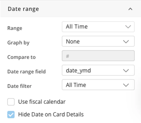 - Hide Date on Card Details: When selected, removes the date range text from the header or footer of the visualization, creating a cleaner interface for dashboards where the time context is already established.