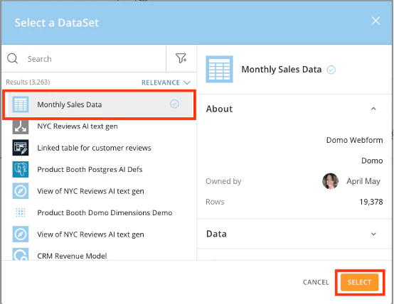 - Add existing card — Allows you to choose from existing cards in your Domo instance to add to your layout.