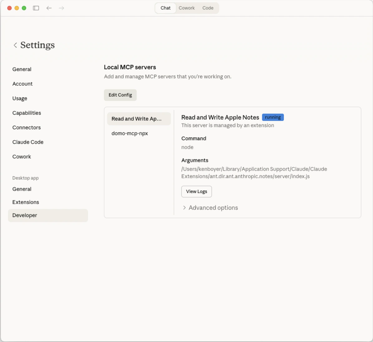 In Claude Desktop, go to Settings > Developer and select Edit Config.