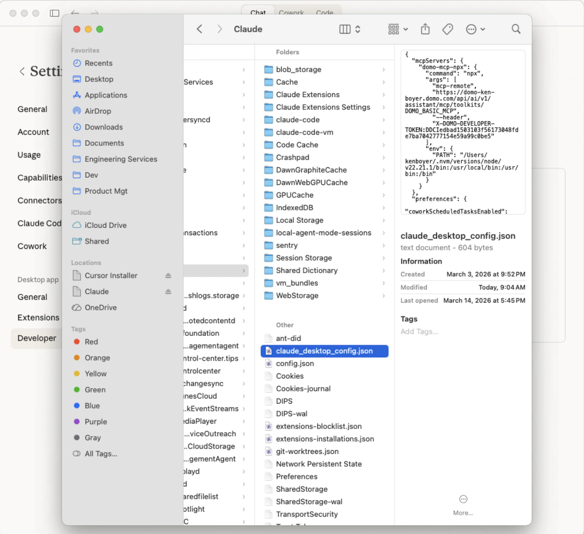 Depending on your environment, you may need to make additional changes to the Claude Desktop configuration. Mac Ifnpx cannot be found, add an env property to the domo-mcp-npx server entry in your configuration, replacing <USER_PATH> with your home directory path: