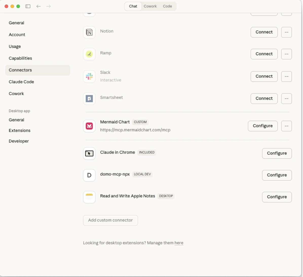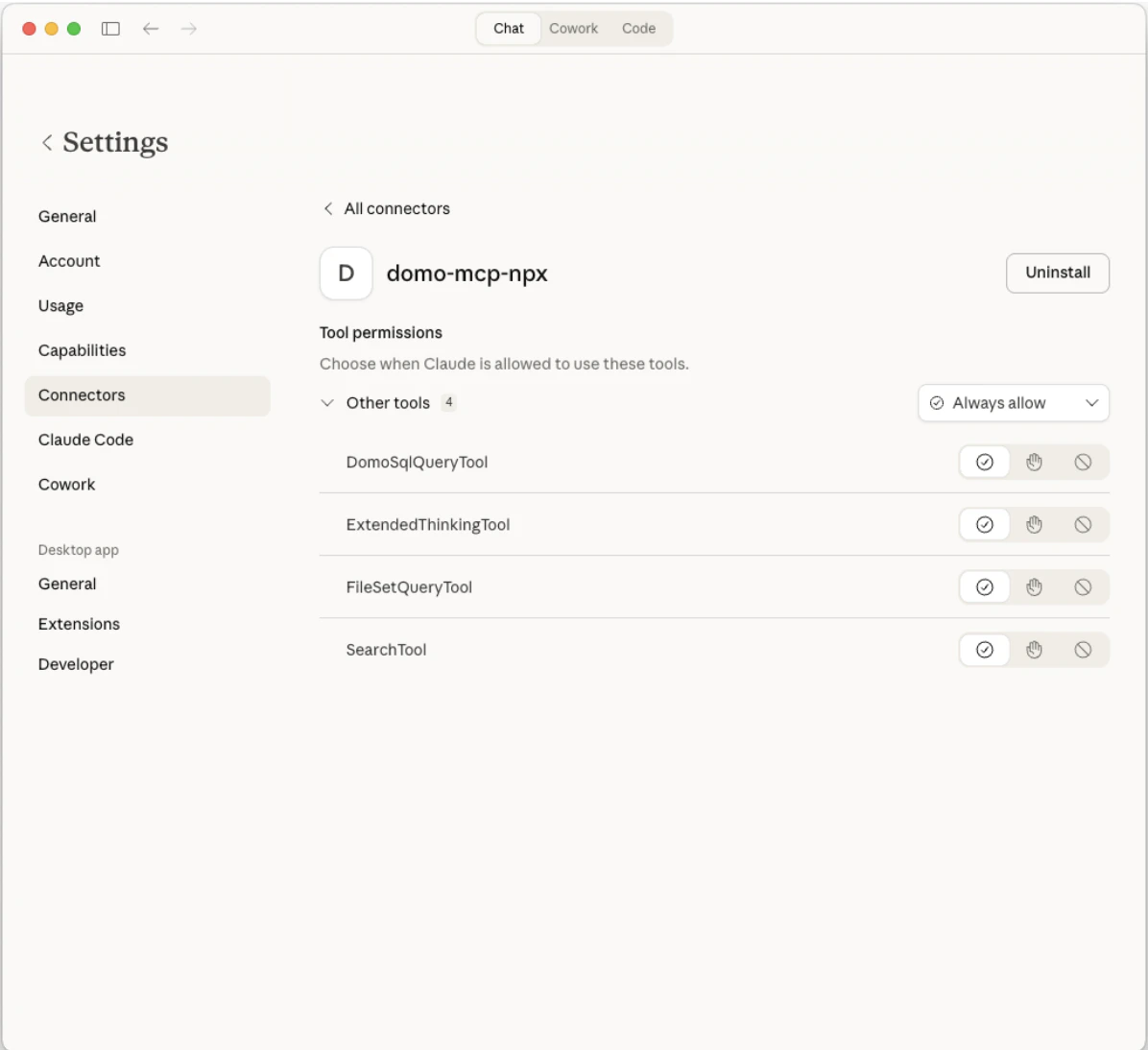 Go to Settings > Connectors and confirm the Domo MCP server is listed and connected.