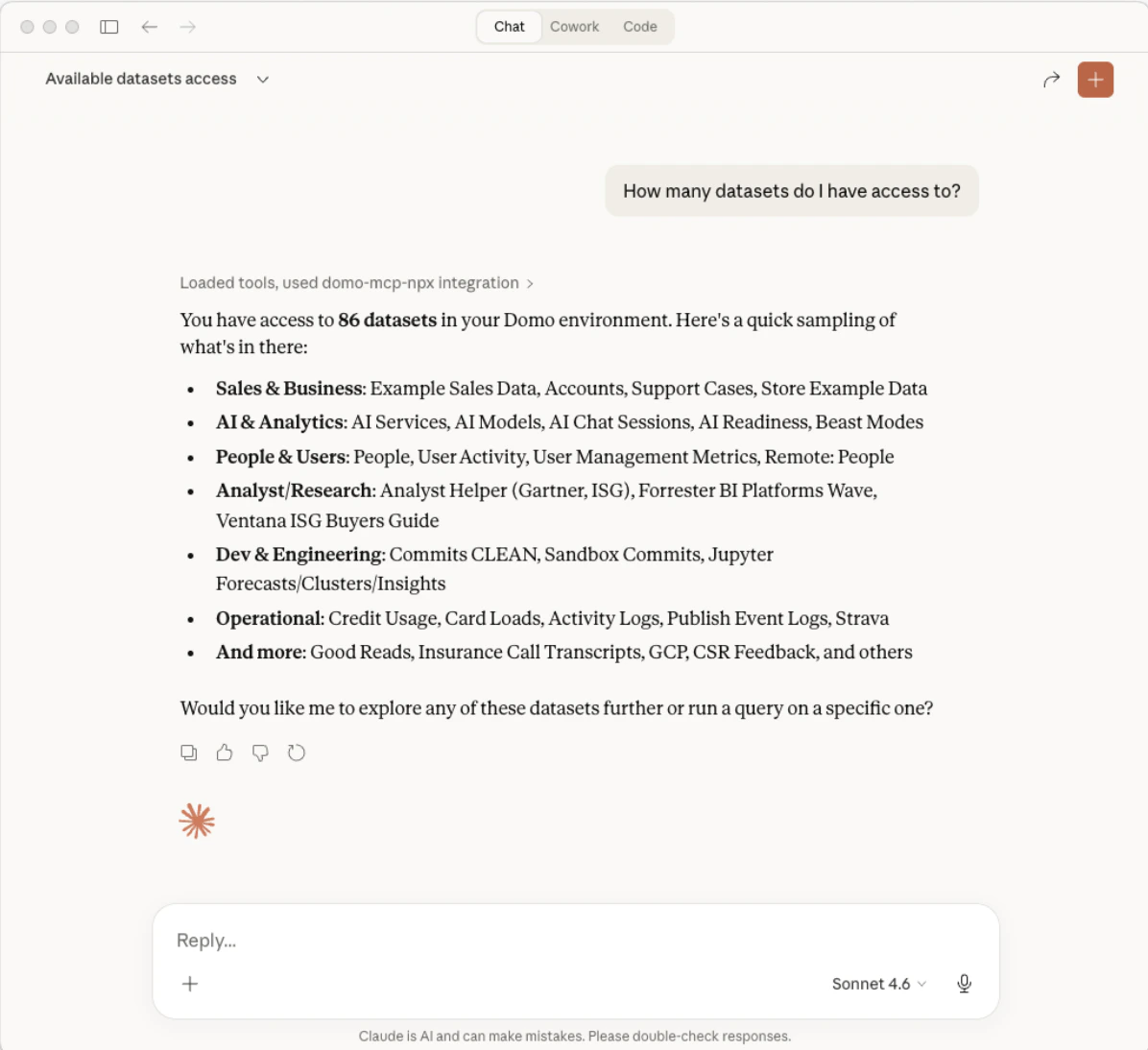 Once connected, you can query your Domo DataSets, query documents stored in Domo, and search across your Domo instance. Card and page summarization are coming soon.