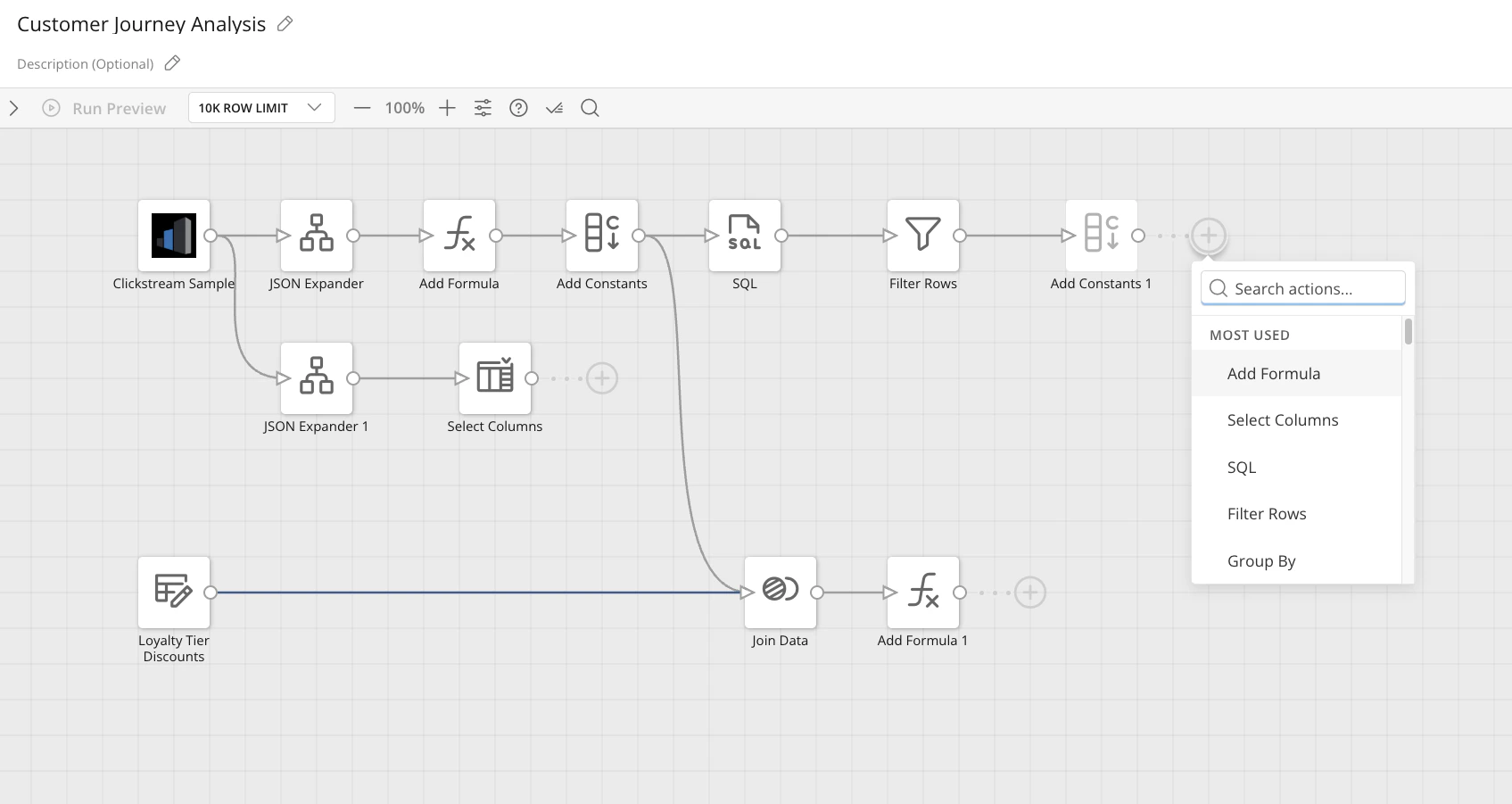 Magic ETL now includes the ability to add a tile directly to the canvas using a plus button that appears next to all non-terminal tiles on the canvas. This button opens a menu that enables you to search for the tile you want to add, or scroll through the list of tiles to choose from, with the most commonly used tiles listed at the top of the list. The feature improves the speed of DataFlow creation and overall workflow efficiency.