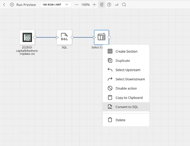 The Convert to SQL option in Magic ETL allows you to see the underlying SQL generated by the drag-and-drop actions in your DataFlows. You can also customize and edit the SQL queries in each tile to be used in external tools or for direct use in other environments. Being able to see the SQL code in your DataFlows allows you and your support teams to better diagnose problems, optimize queries, and improve overall performance.