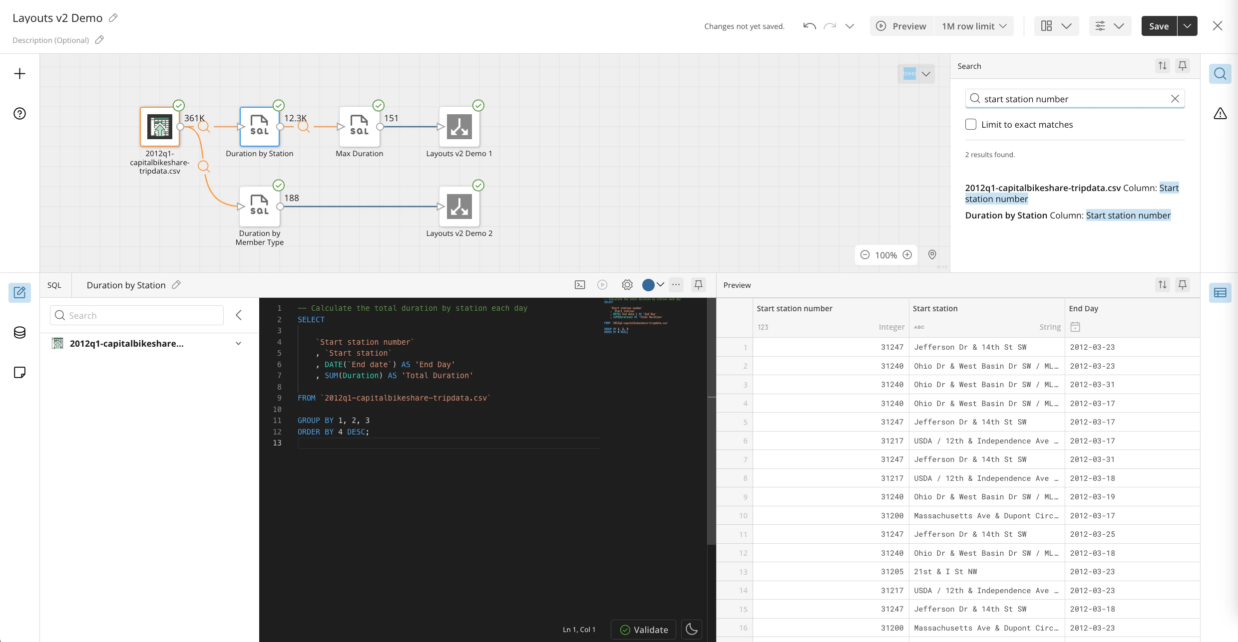 Panels in the new Magic ETL canvas interface have been converted into tools that can be moved to different parts of the screen. You can set layouts depending on how you like to work on different screens and in different scenarios; and save and persist your layouts across DataFlows. You can also choose your panel placement and select whether panels are pinned open or closed by default.