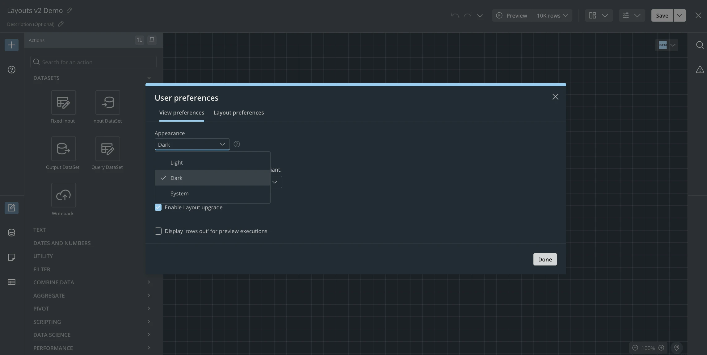 Dark mode is now available in the Magic ETL canvas. This new setting allows you to select a default mode for your canvas, including light, dark, or the option to inherit from the system setting, giving you control of how you view and use Magic ETL.