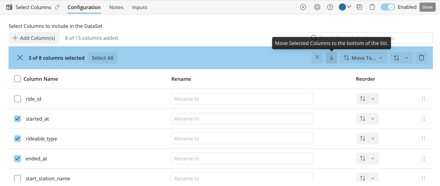 The Select Columns tile has been re-designed to make it easier for you to use. Updates include:- The ability to move single columns to the top, bottom, or anywhere in the list of selected columns
